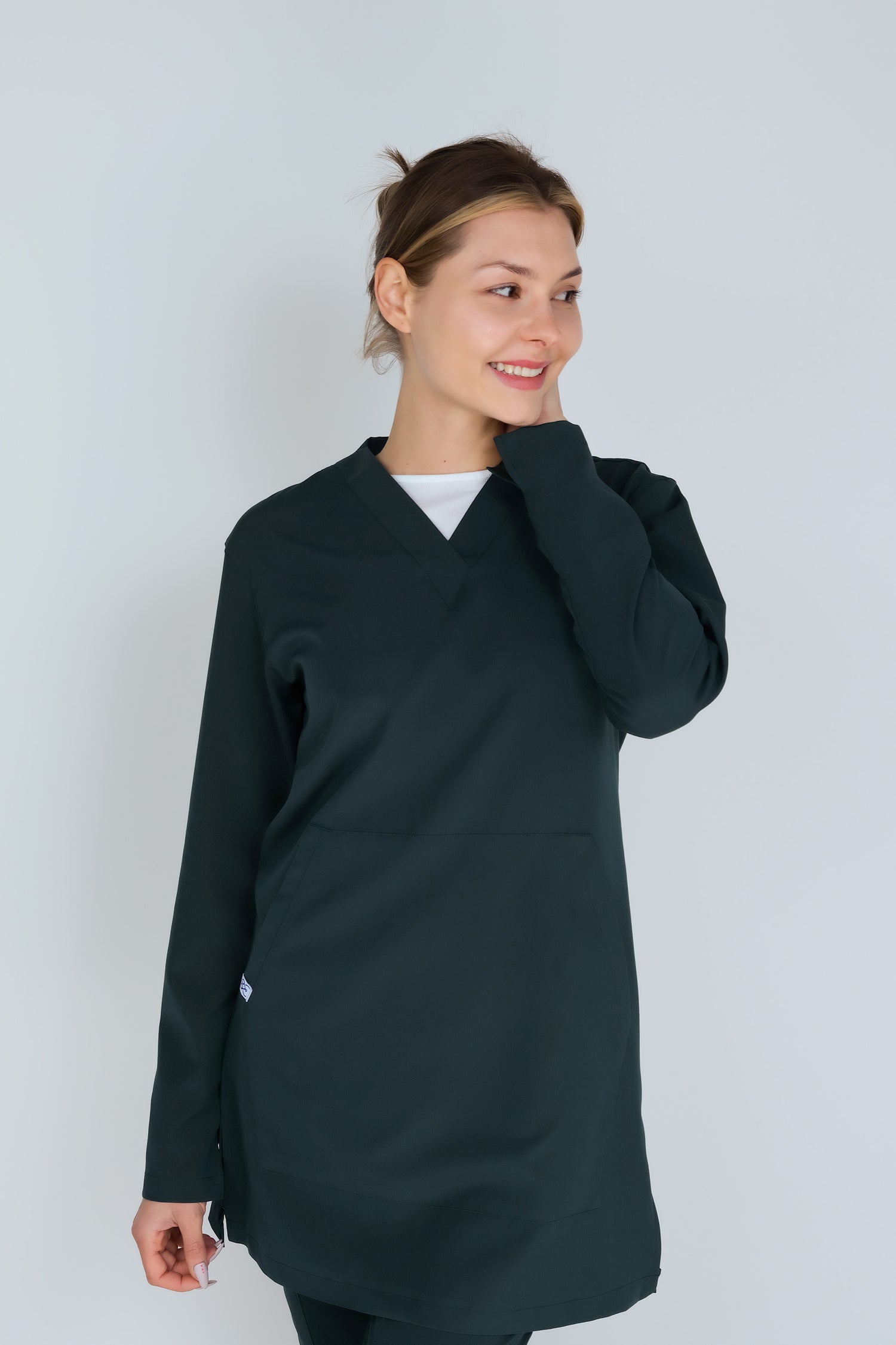 Primus Macropus Outlet - Yeşil Tesettür V Yaka Kanguru Cepli Kadın Tek Üst Üniforma